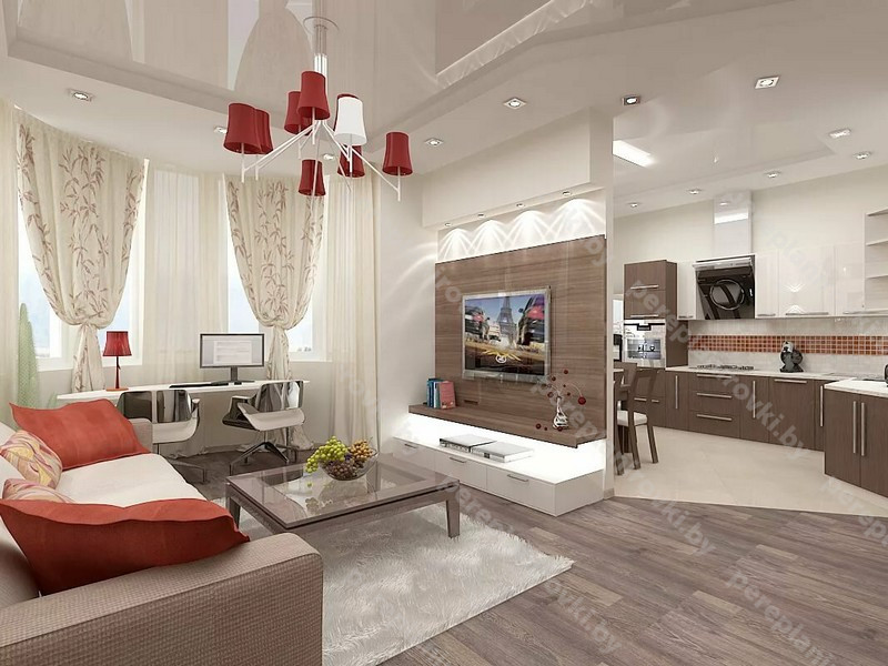 - Создание единого пространства путем полного или частичного сноса перегородки требует функционального зонирования. Оно осуществляется за счет использования различных материалов и конструкций.