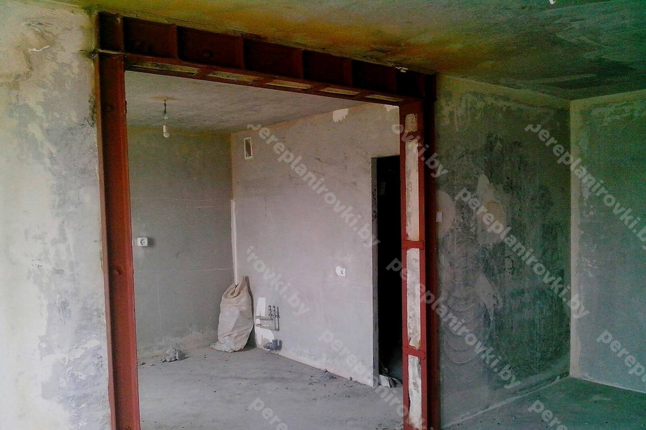 - Устройство проёма между жилой и кухней в несущей стене с усилением металлической рамой опорной РОМ.