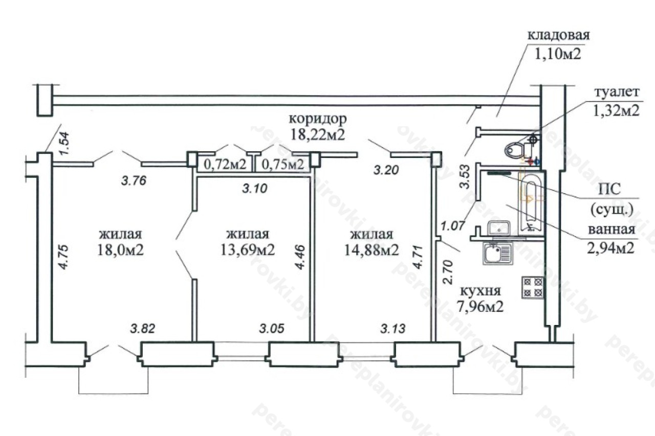 Выполнили проект перепланировки квартиры по Козлова д.8 в Минске представляет собой следующие решения:
