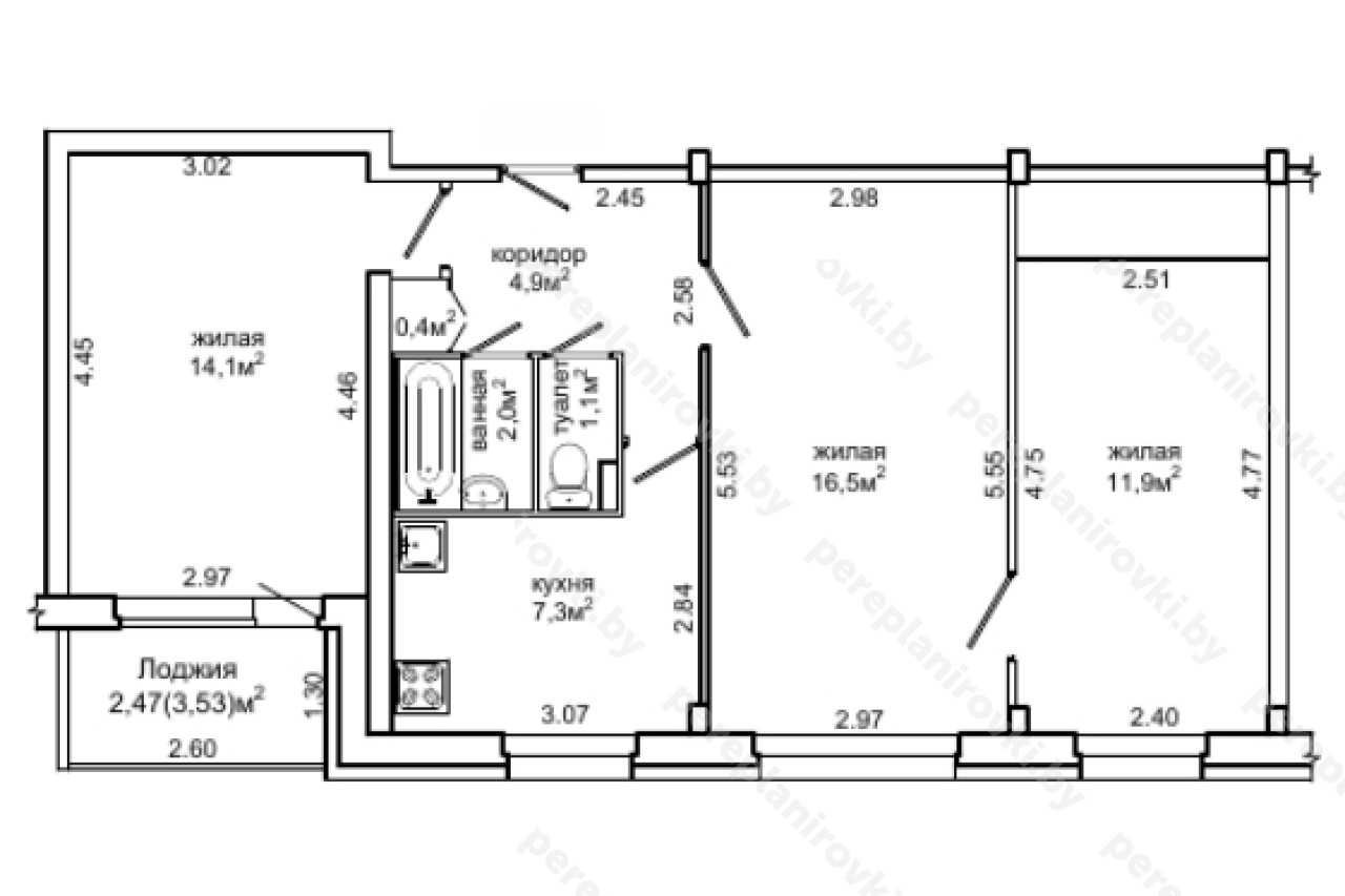 Выполнили проект перепланировки по улице Куйбышева д. 46 в Минске представляет собой следующие решения: