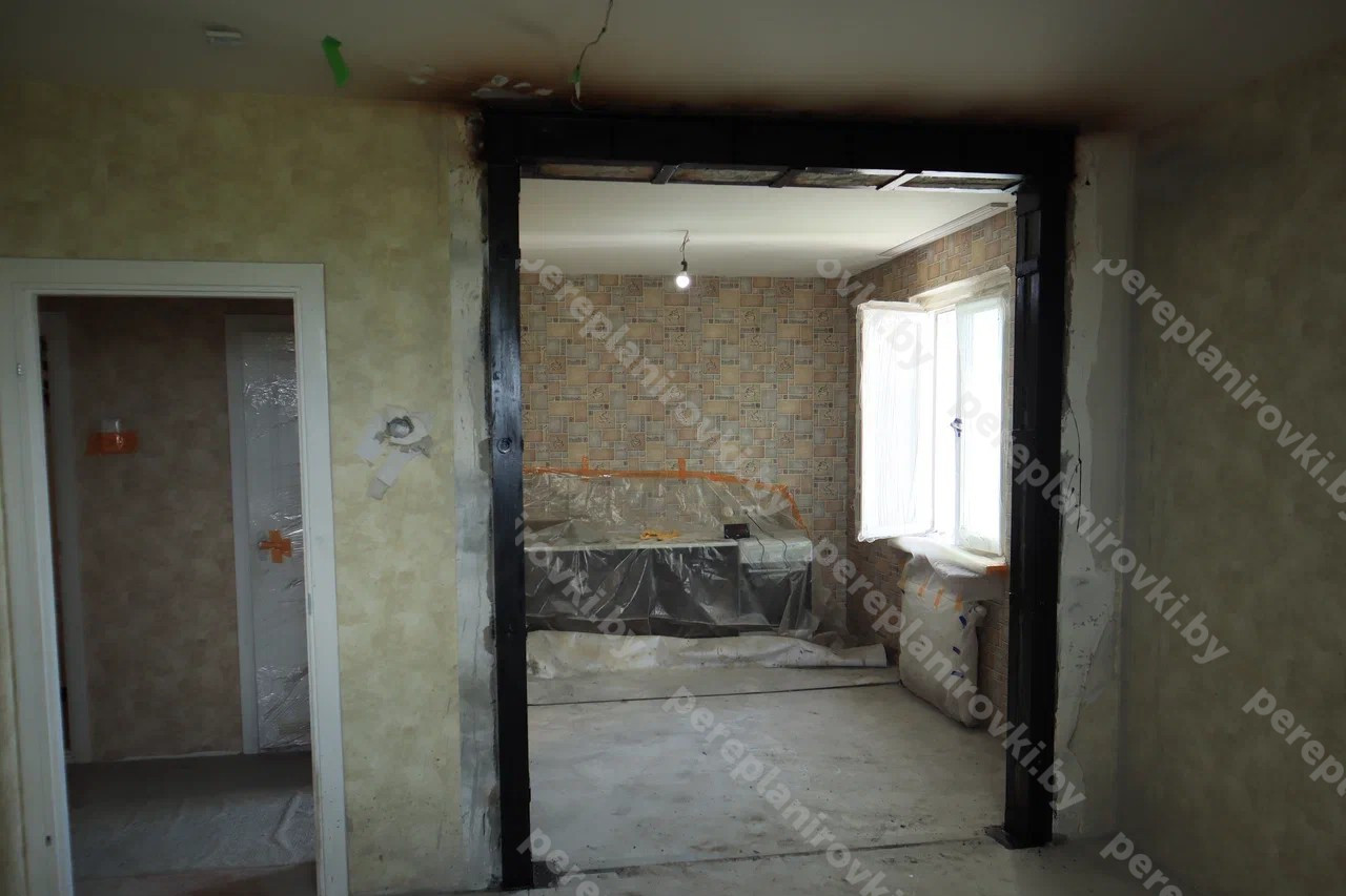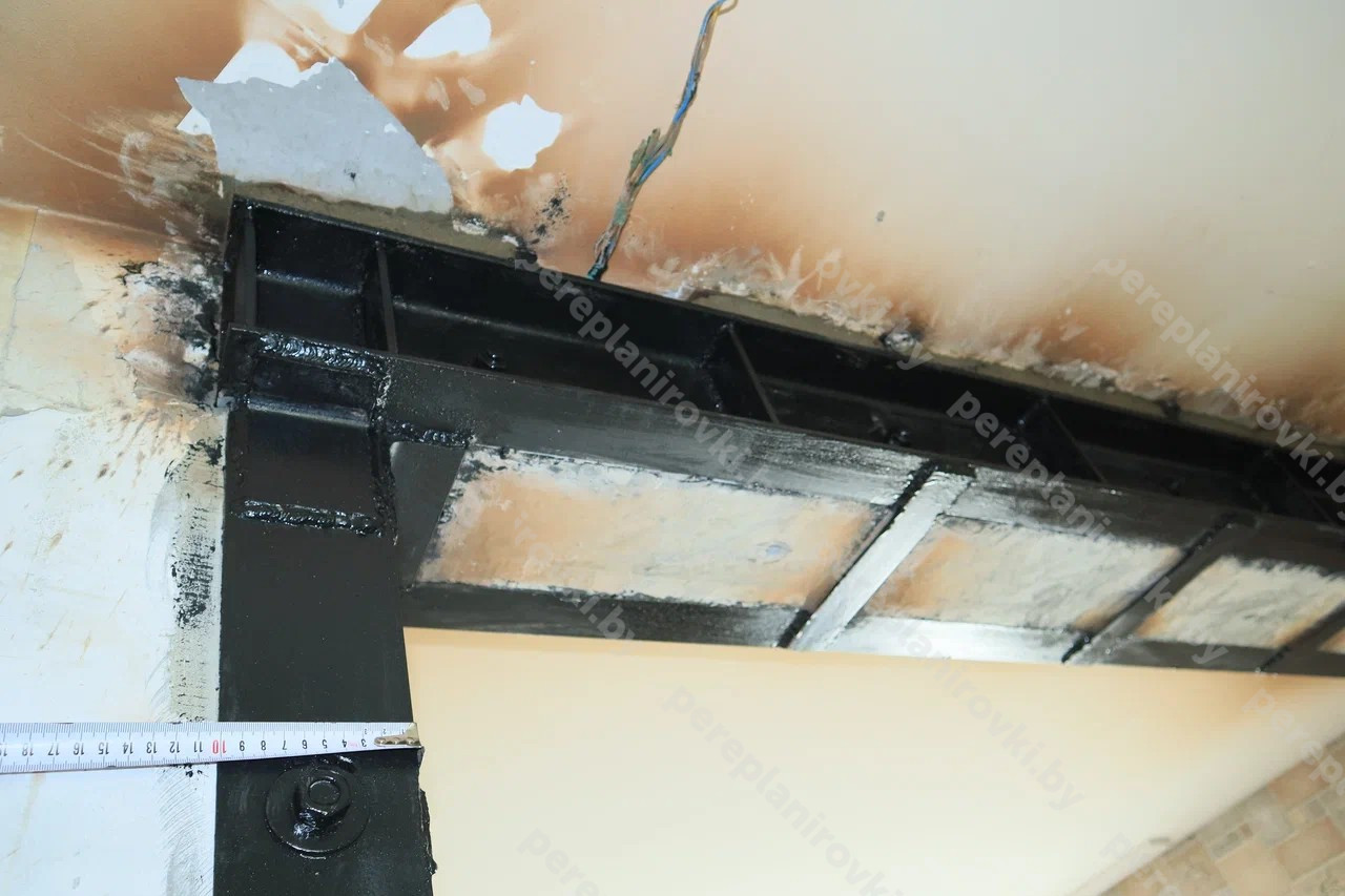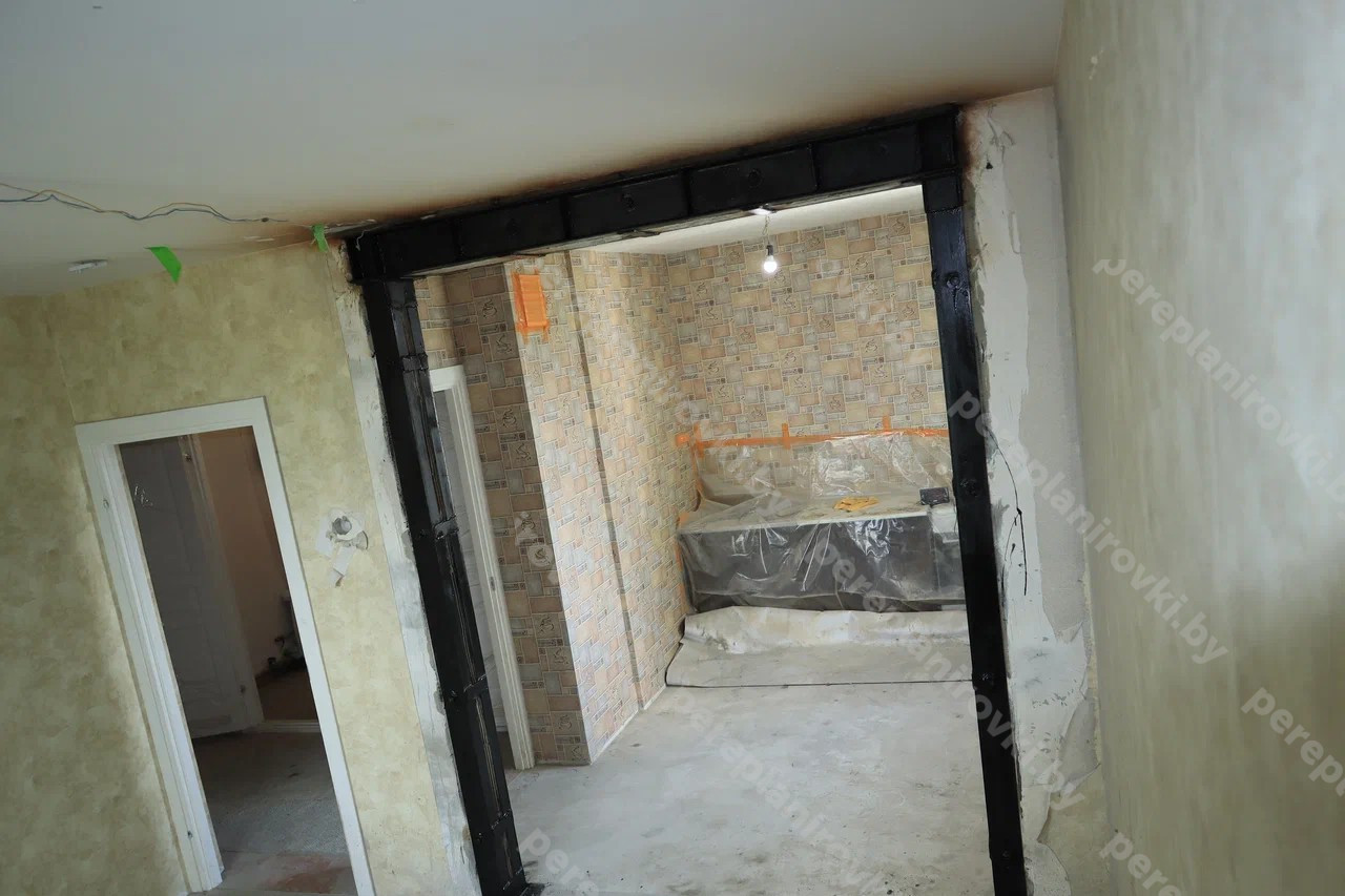 - Устройство проёма между жилой и кухней в несущей стене с усилением металлической рамой опорной РОМ1;