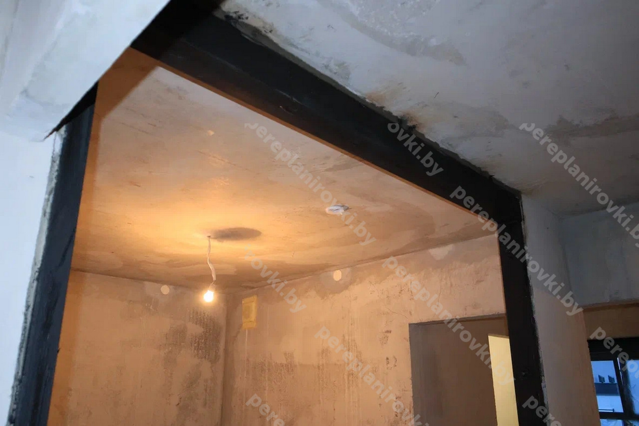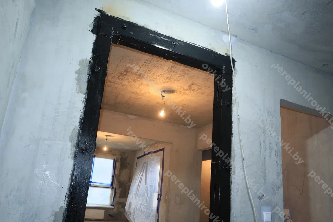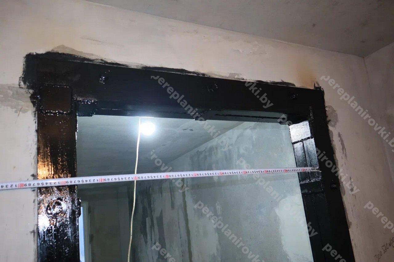 - Выполнили строй работы по усилению рамой опорной металлической РОМ1 нового проёма между жилой комнатой и кухней. (применили раму "скрытого" исполнения: после отделки не видно).