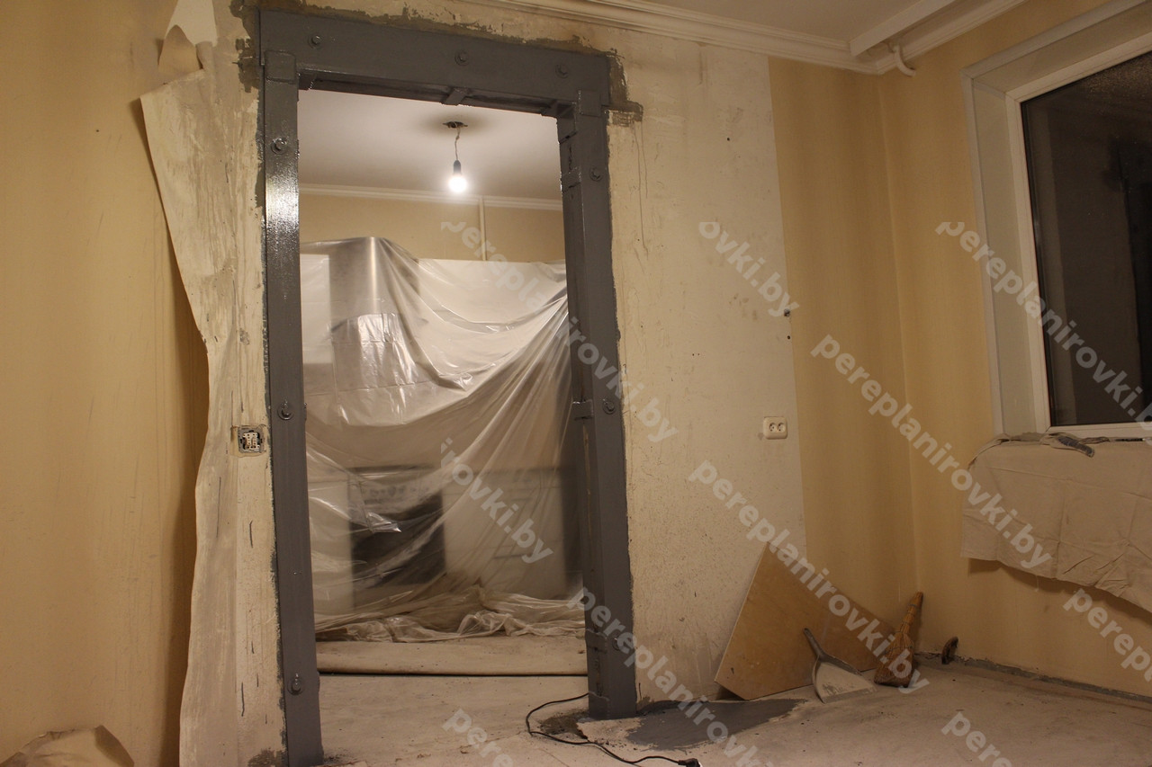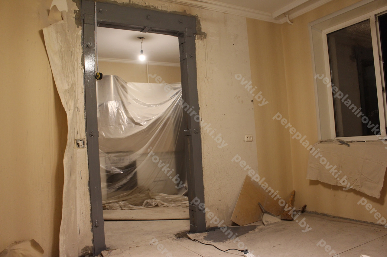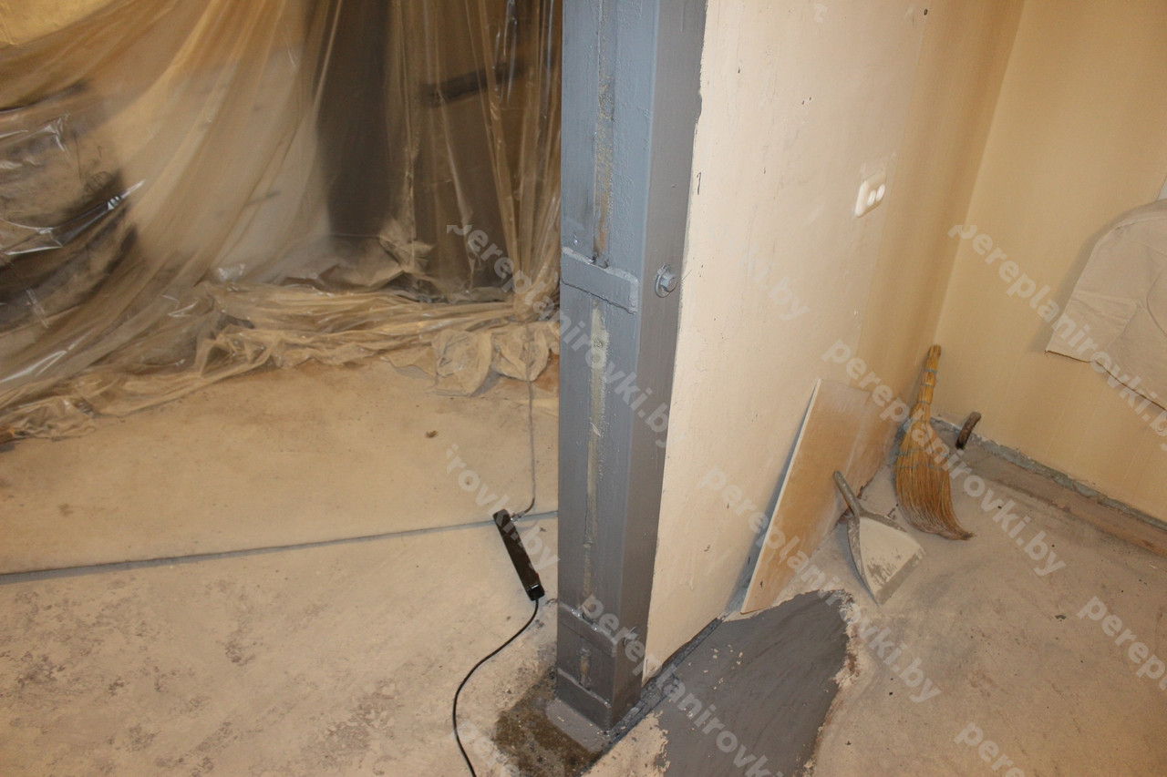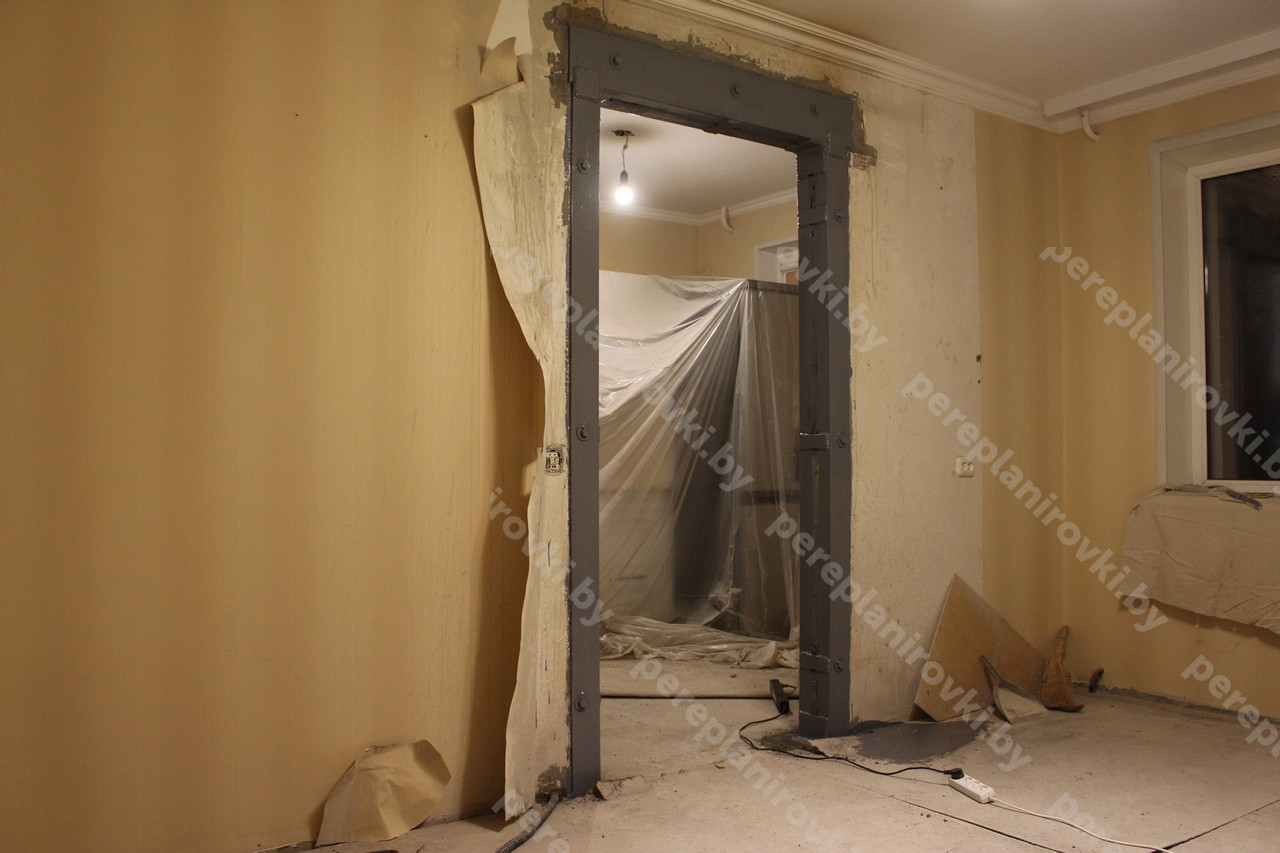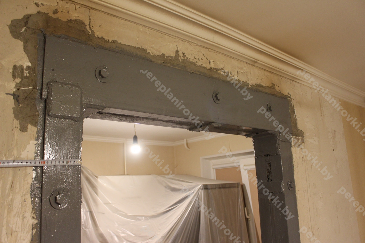 - Сделали конструкторский расчёт по усилению существующего проёма в несущей стене между кухней и комнатой. обследовали верхний и нижний этажи на предмет наличия вновь устроенных проёмов в несущих стенах.