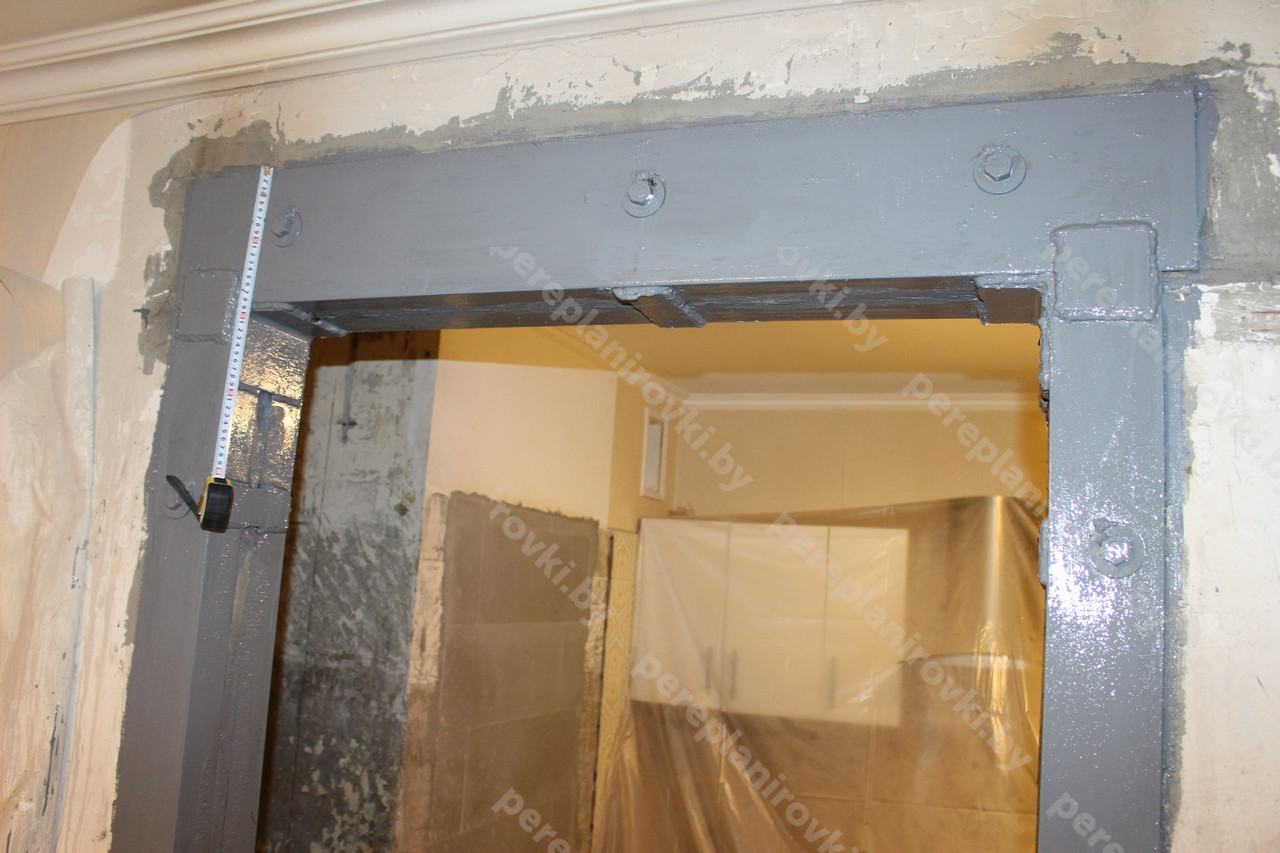 - Произвели монтаж рамы опорной металлической - РОМ между кухней и комнатой применяя в качестве ригеля швеллер c обрезанной полкой, а стоек из уголков.